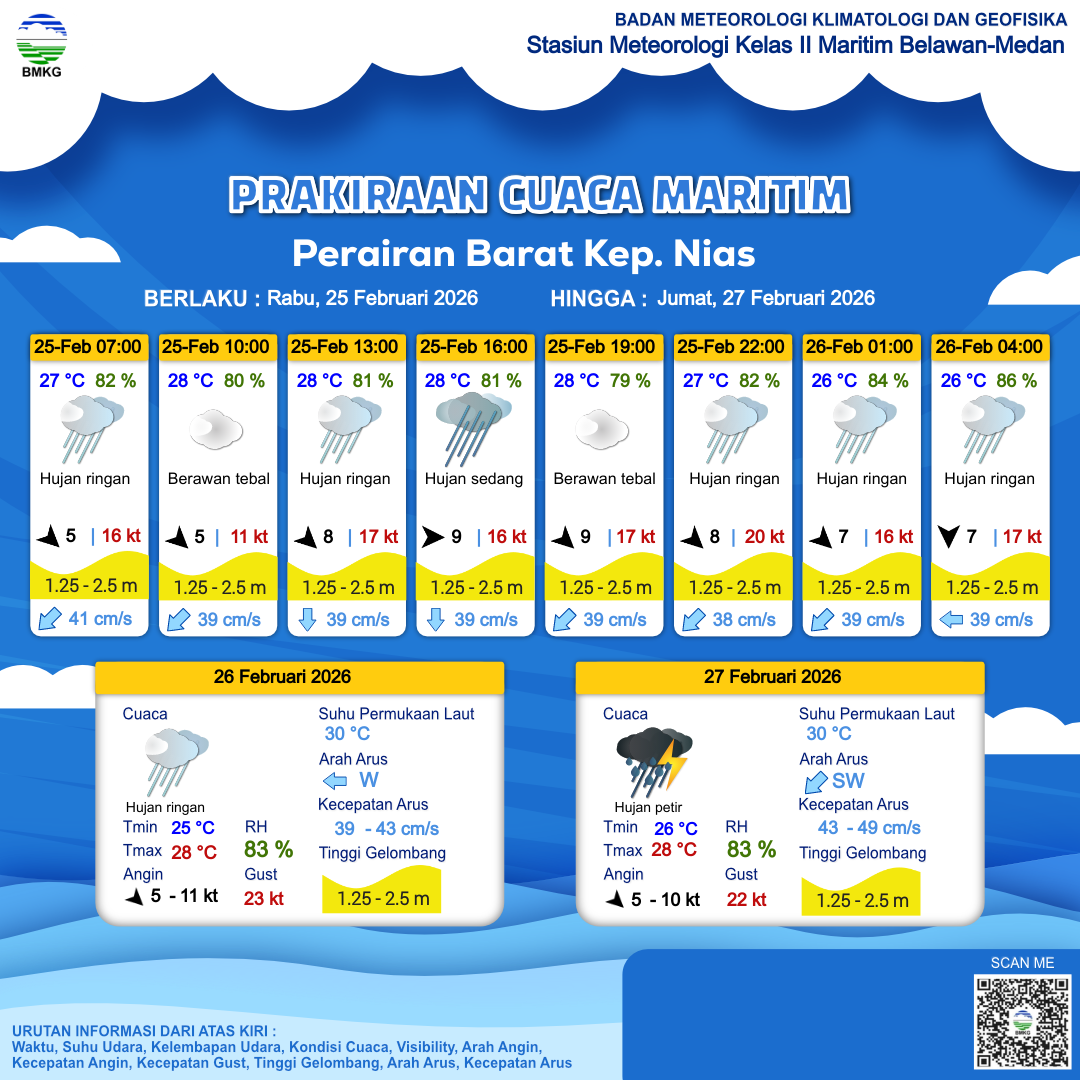 25 Feb 26, 22.00 3 jam kedepan | Hujan Ringan | Utara 7 kt Gust Peningkatan kecepatan angin yang singkat dan tiba-tiba : 16 kt | | | 26 °C | 86 % |