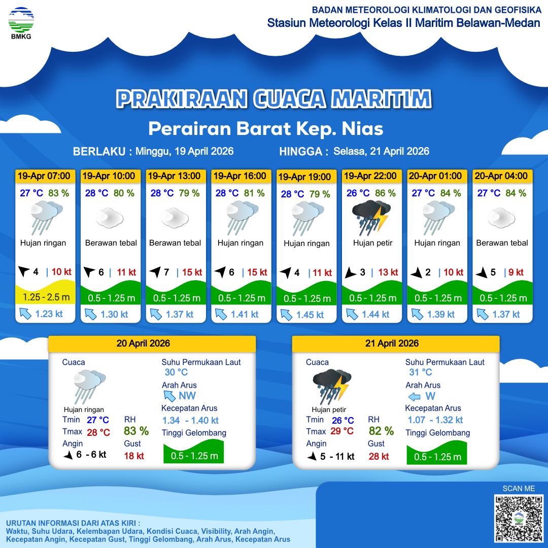 19 Apr 26, 06.00 2 jam kedepan | Barat Daya 7 kt Gust Peningkatan kecepatan angin yang singkat dan tiba-tiba : 15 kt | 1.1 m Rendah | Barat Laut 1.4 Knots | 28 °C | 79 % | |