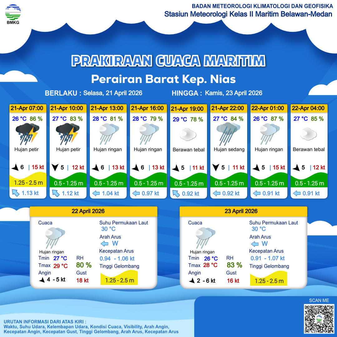 22 Apr 26, 21.00 22 jam kedepan | Barat 5 kt Gust Peningkatan kecepatan angin yang singkat dan tiba-tiba : 16 kt | 1.1 m Rendah | Barat 0.9 Knots | 26 °C | 86 % | |