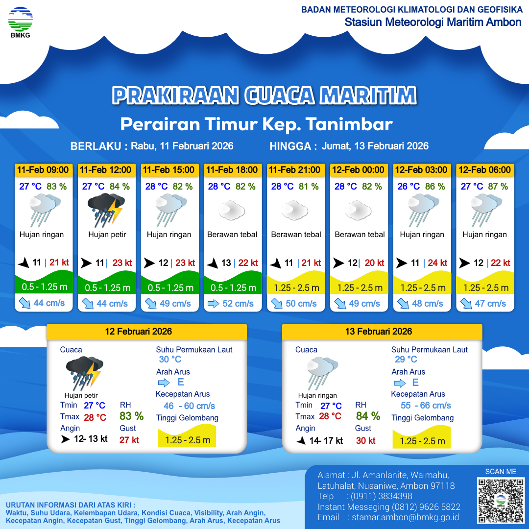 11 Feb 26, 23.00 16 jam kedepan | Barat 12 kt Gust Peningkatan kecepatan angin yang singkat dan tiba-tiba : 23 kt | 1.3 m Sedang | Tenggara 45.0 cm/s | 27 °C | 85 % |