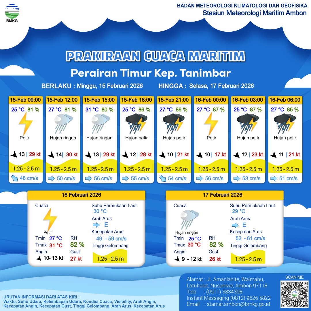 15 Feb 26, 13.00 5 jam kedepan | Barat Laut 10 kt Gust Peningkatan kecepatan angin yang singkat dan tiba-tiba : 18 kt | 1.4 m Sedang | Timur 46.0 cm/s | 28 °C | 83 % | |