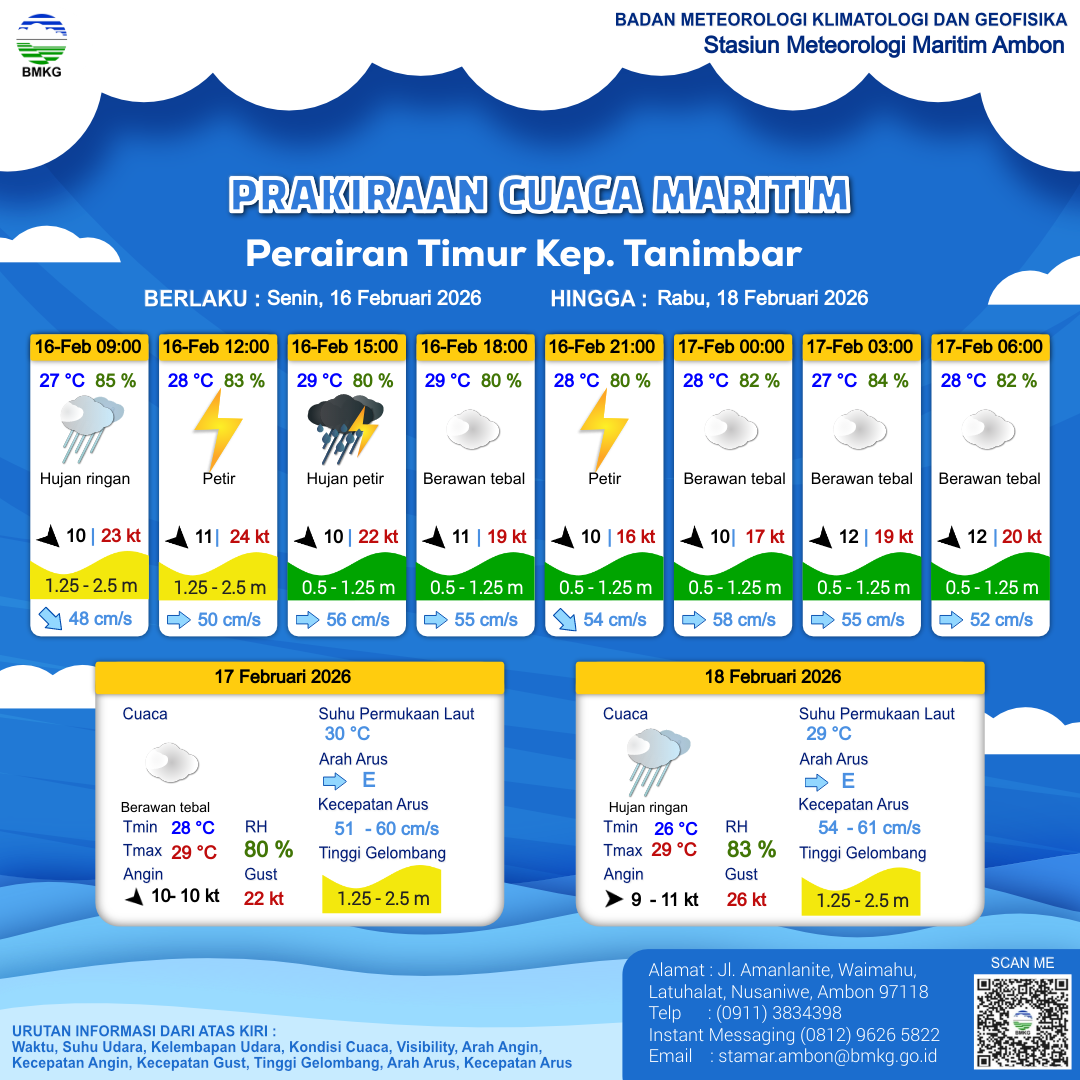 16 Feb 26, 17.00 2 jam kedepan | Barat Laut 12 kt Gust Peningkatan kecepatan angin yang singkat dan tiba-tiba : 19 kt | 1.1 m Rendah | Tenggara 44.0 cm/s | 27 °C | 83 % | |