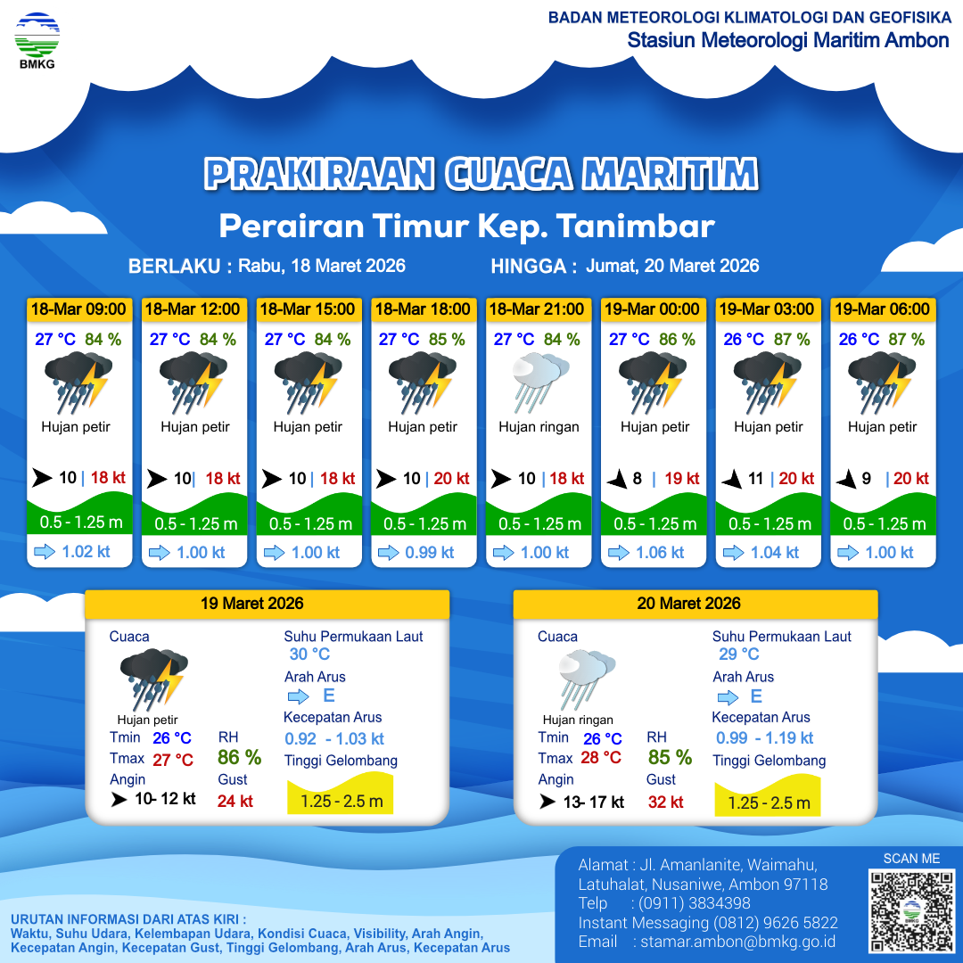 18 Mar 26, 03.00 16 jam yang lalu | Hujan Ringan | Barat 10 kt Gust Peningkatan kecepatan angin yang singkat dan tiba-tiba : 17 kt | | | 27 °C | 84 % |