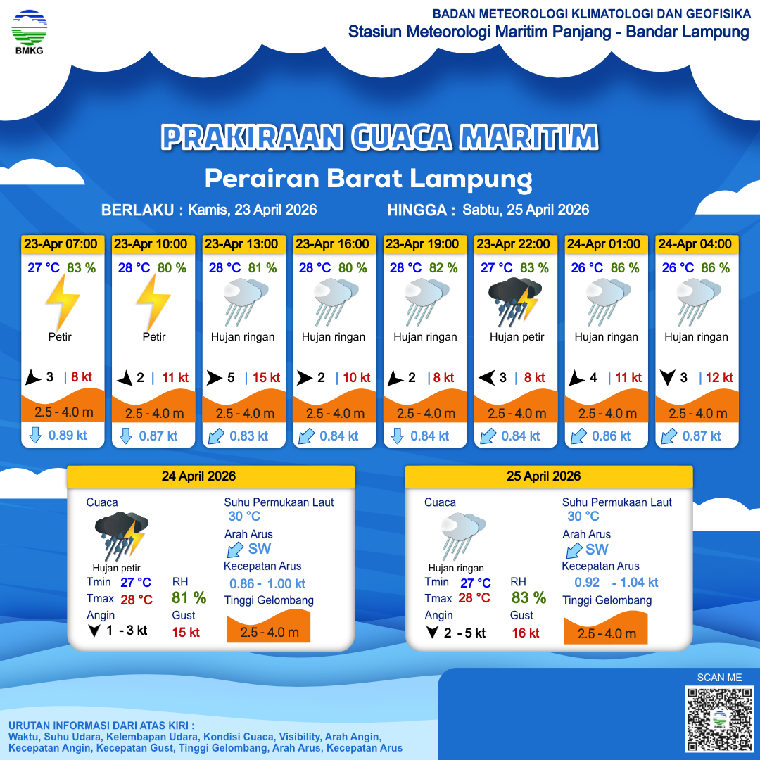 23 Apr 26, 00.00 24 jam kedepan | Barat Laut 6 kt Gust Peningkatan kecepatan angin yang singkat dan tiba-tiba : 13 kt | 2.5 m Tinggi | Barat Daya 0.9 Knots | 27 °C | 84 % | |