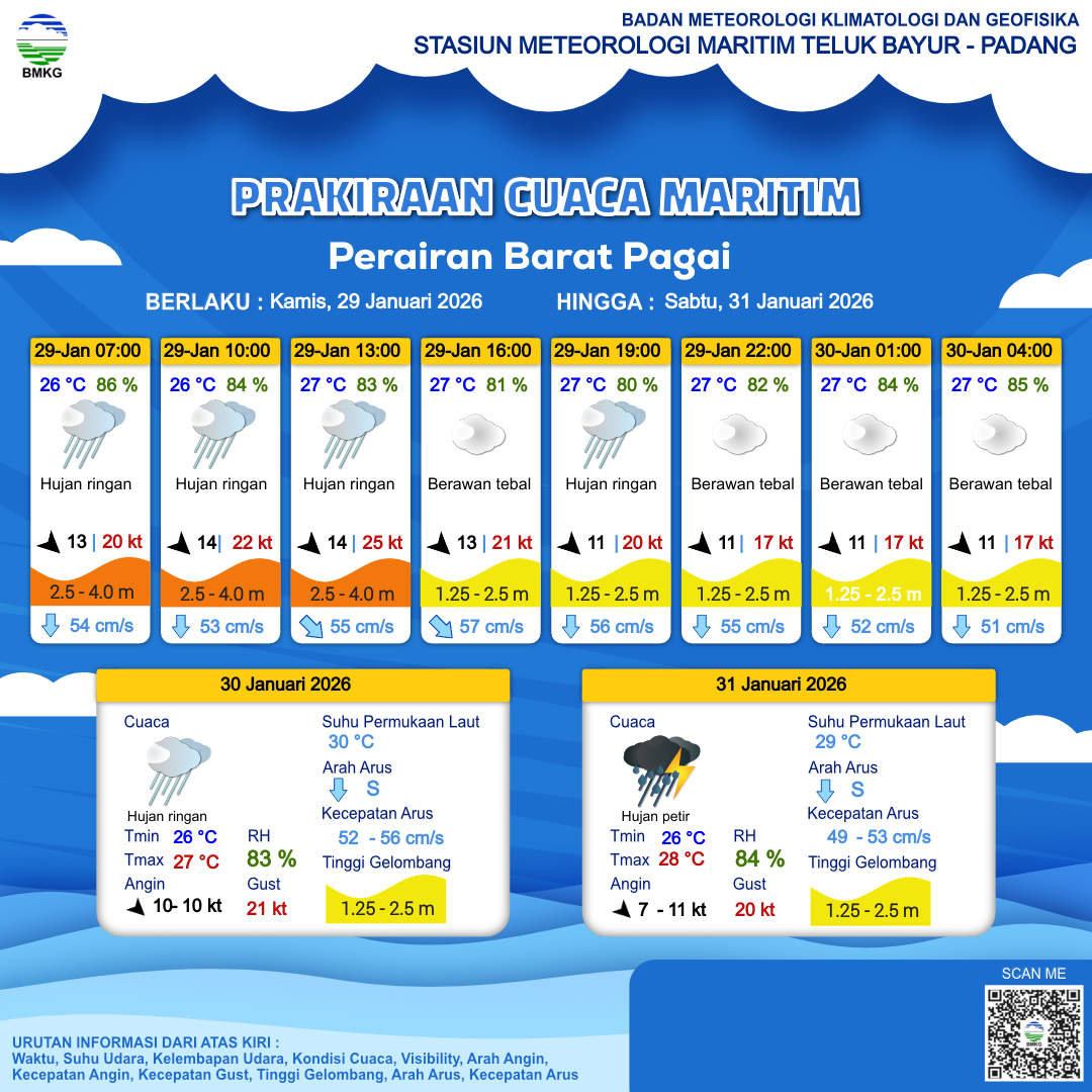 29 Jan 26, 20.00 4 jam kedepan | Barat Laut 11 kt Gust Peningkatan kecepatan angin yang singkat dan tiba-tiba : 17 kt | 2.3 m Sedang | Selatan 51.0 cm/s | 27 °C | 85 % | |