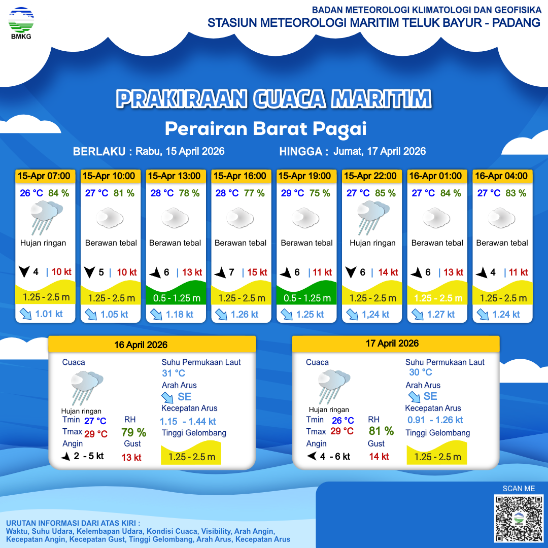15 Apr 26, 19.00 3 jam kedepan | Barat Laut 6 kt Gust Peningkatan kecepatan angin yang singkat dan tiba-tiba : 12 kt | 1.3 m Sedang | Tenggara 1.3 Knots | 27 °C | 84 % | |