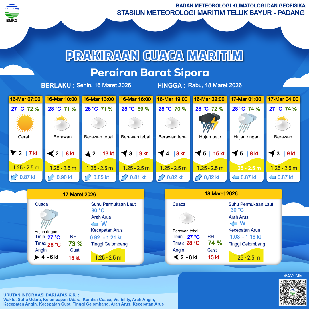 16 Mar 26, 23.00 6 jam kedepan | Selatan 4 kt Gust Peningkatan kecepatan angin yang singkat dan tiba-tiba : 9 kt | 1.7 m Sedang | Barat Laut 0.9 Knots | 27 °C | 76 % |