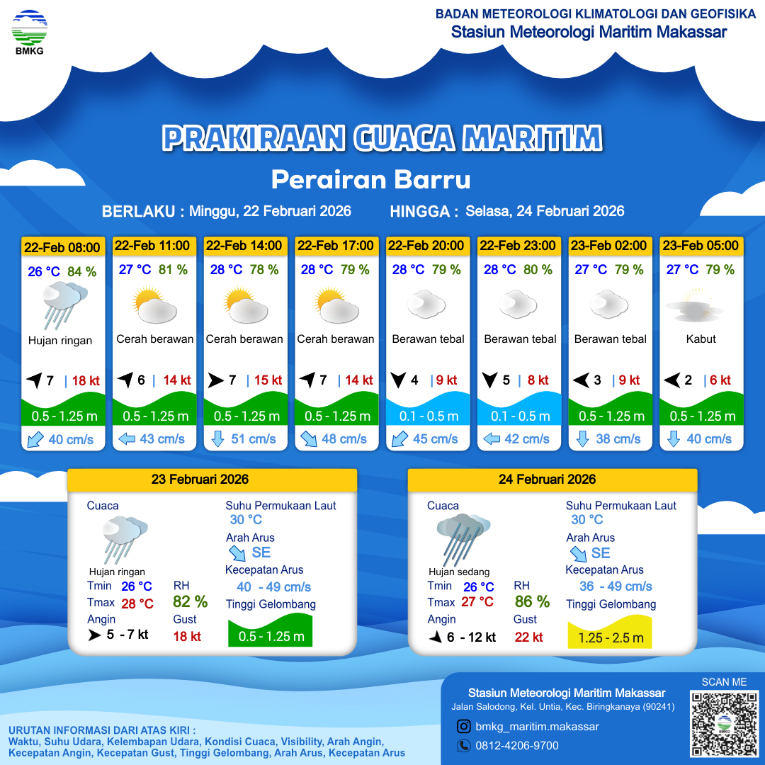 21 Feb 26, 23.00 2 jam kedepan | Hujan Ringan | Barat Laut 2 kt Gust Peningkatan kecepatan angin yang singkat dan tiba-tiba : 11 kt | | | 26 °C | 84 % |