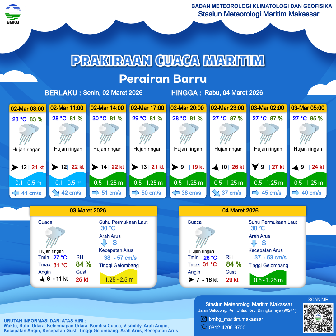 2 Mar 26, 11.00 2 jam kedepan | Barat 9 kt Gust Peningkatan kecepatan angin yang singkat dan tiba-tiba : 20 kt | 0.9 m Rendah | Timur Laut 42.0 cm/s | 28 °C | 82 % | |