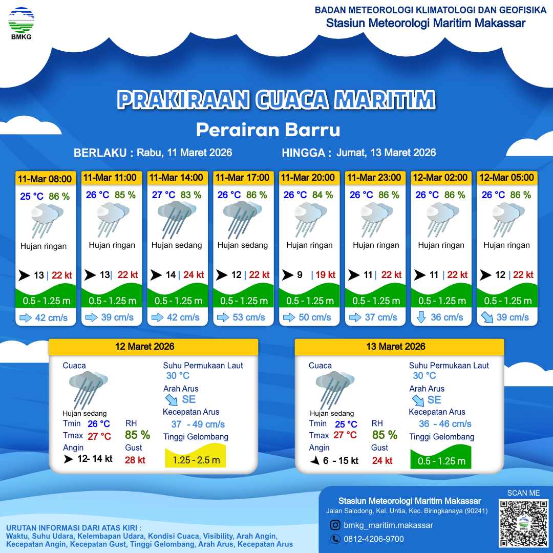 12 Mar 26, 00.00 10 jam kedepan | Barat 14 kt Gust Peningkatan kecepatan angin yang singkat dan tiba-tiba : 26 kt | 1.1 m Rendah | Timur 42.0 cm/s | 26 °C | 86 % | |