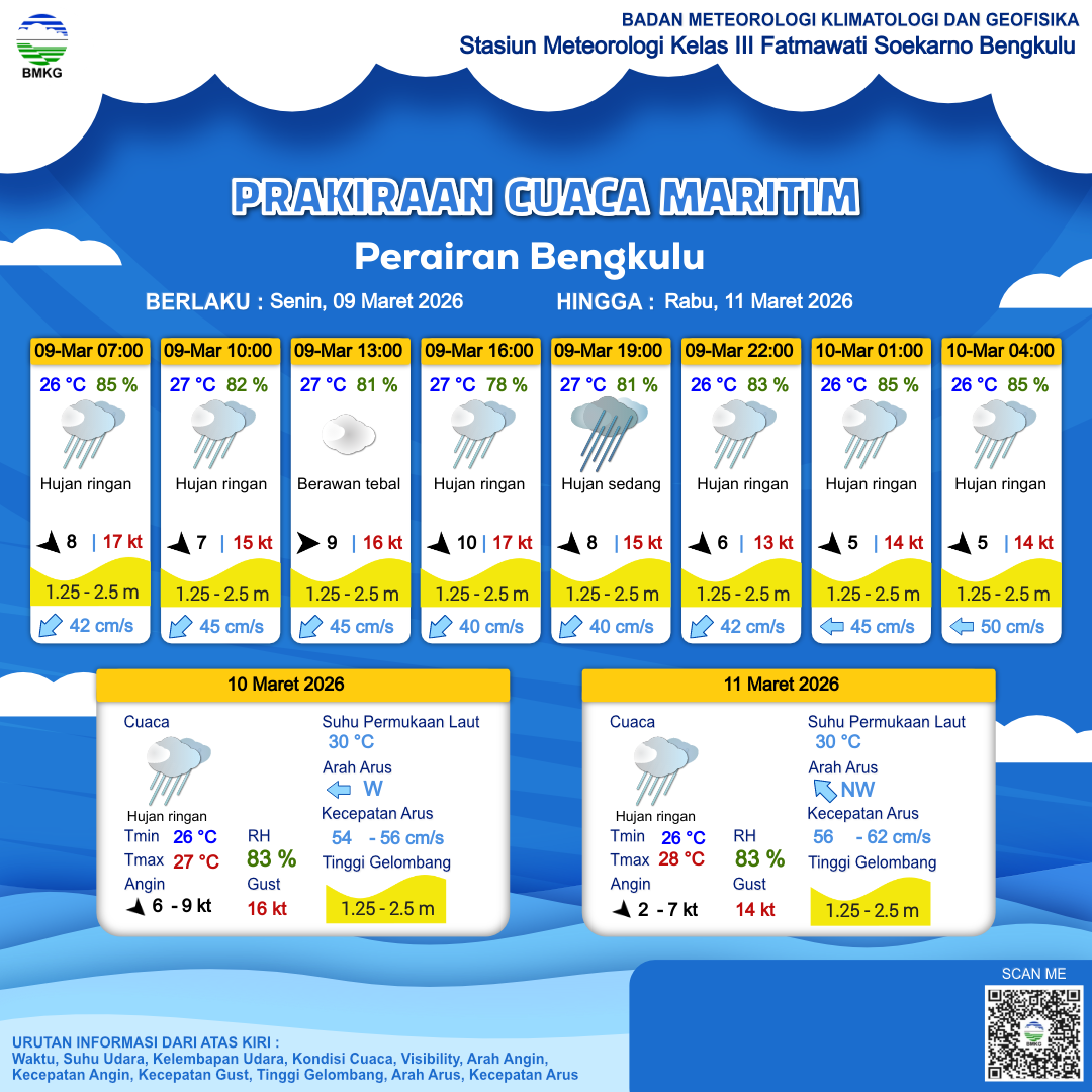 9 Mar 26, 06.00 20 jam kedepan | Barat Laut 9 kt Gust Peningkatan kecepatan angin yang singkat dan tiba-tiba : 17 kt | 1.8 m Sedang | Barat Daya 44.0 cm/s | 27 °C | 82 % | |