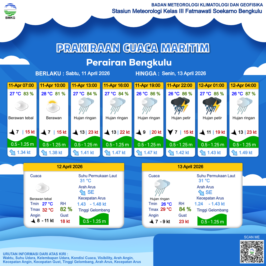 11 Apr 26, 21.00 7 jam kedepan | Barat Laut 13 kt Gust Peningkatan kecepatan angin yang singkat dan tiba-tiba : 23 kt | 0.8 m Rendah | Tenggara 1.5 Knots | 26 °C | 87 % | |