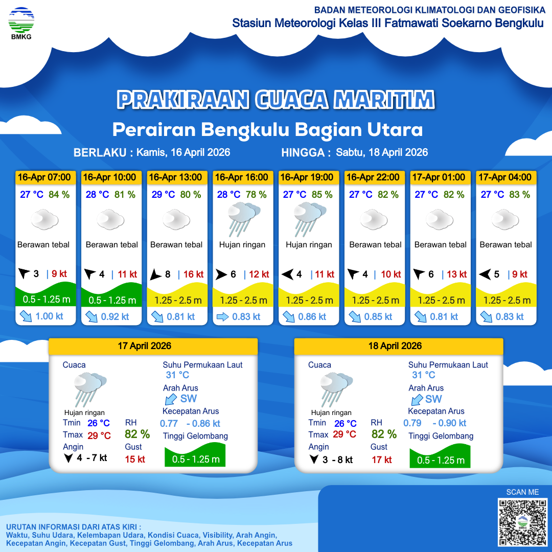 17 Apr 26, 10.00 12 jam kedepan | Barat Daya 7 kt Gust Peningkatan kecepatan angin yang singkat dan tiba-tiba : 12 kt | 1.4 m Sedang | Timur Laut 0.8 Knots | 29 °C | 77 % | |