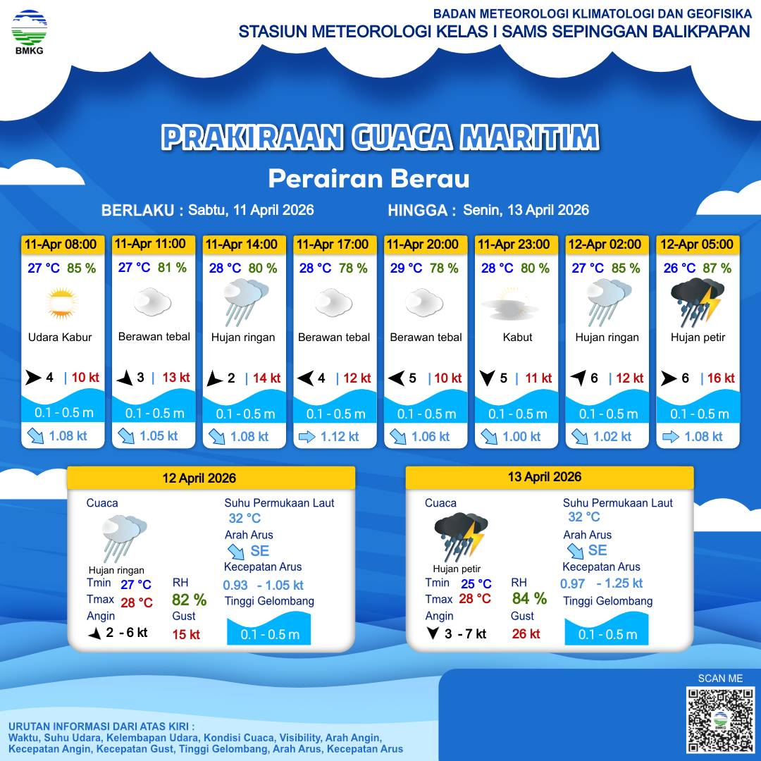 11 Apr 26, 18.00 4 jam kedepan | Barat Daya 6 kt Gust Peningkatan kecepatan angin yang singkat dan tiba-tiba : 12 kt | 0.4 m Tenang | Tenggara 1.0 Knots | 27 °C | 85 % | |