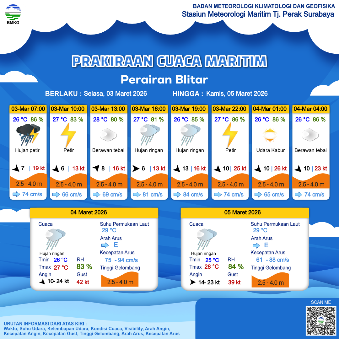3 Mar 26, 20.00 2 jam kedepan | Barat Laut 10 kt Gust Peningkatan kecepatan angin yang singkat dan tiba-tiba : 22 kt | 3.2 m Tinggi | Timur 69.0 cm/s | 26 °C | 86 % | |