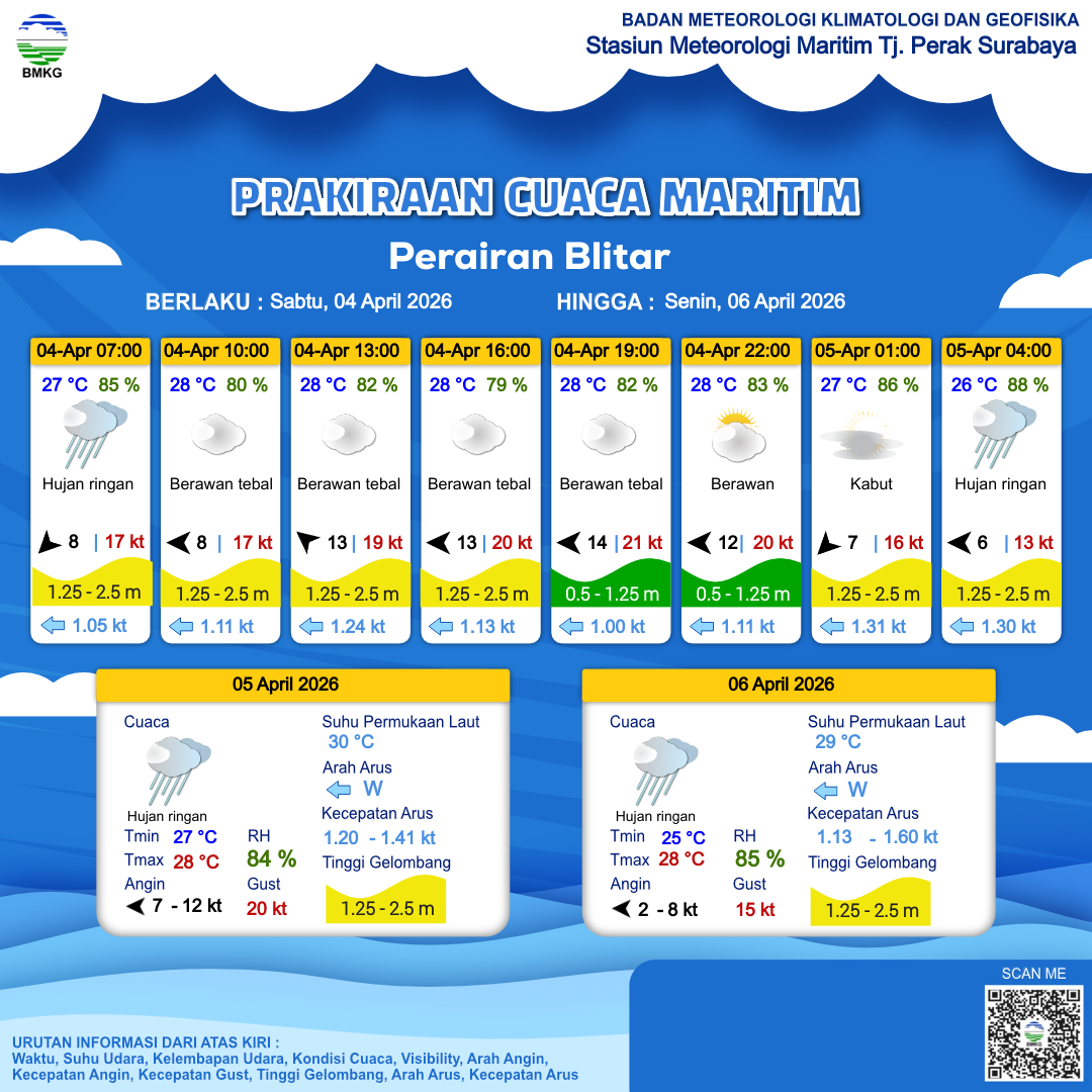 4 Apr 26, 22.00 2 jam kedepan | Kabut | Timur 6 kt Gust Peningkatan kecepatan angin yang singkat dan tiba-tiba : 14 kt | | | 26 °C | 88 % |