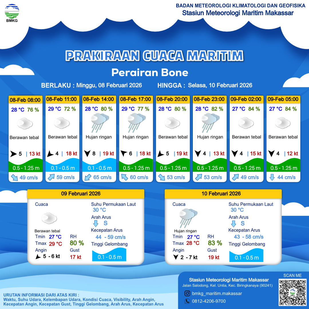 8 Feb 26, 08.00 4 jam kedepan | Tenggara 6 kt Gust Peningkatan kecepatan angin yang singkat dan tiba-tiba : 19 kt | 0.4 m Tenang | Barat Laut 63.0 cm/s | 29 °C | 78 % | |