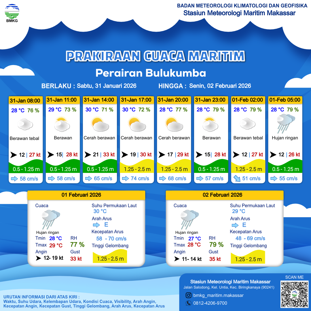31 Jan 26, 20.00 3 jam kedepan | Barat 12 kt Gust Peningkatan kecepatan angin yang singkat dan tiba-tiba : 25 kt | 1.3 m Sedang | Timur 51.0 cm/s | 28 °C | 78 % | |