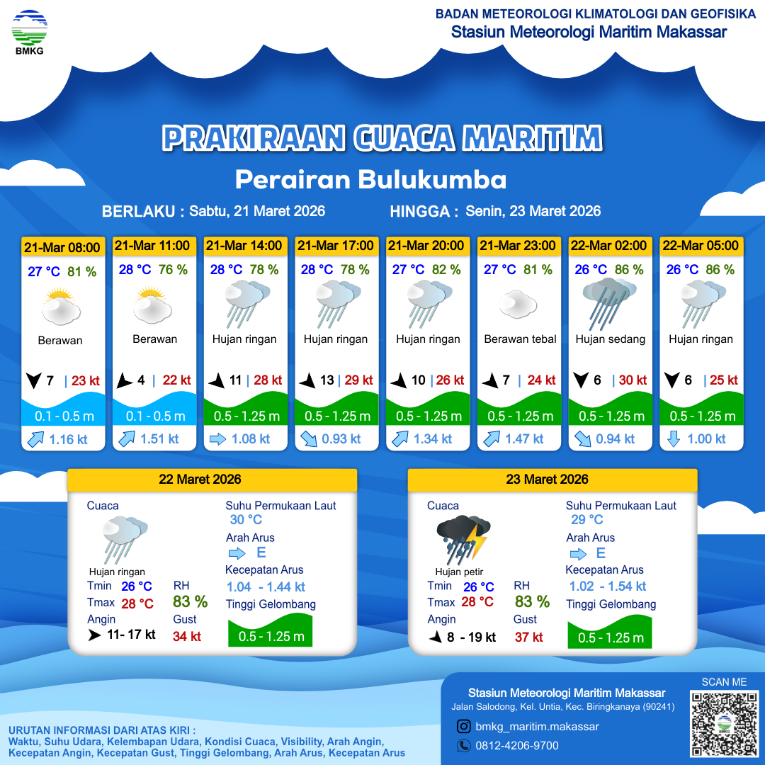 21 Mar 26, 02.00 2 jam kedepan | Timur Laut 4 kt Gust Peningkatan kecepatan angin yang singkat dan tiba-tiba : 23 kt | 0.4 m Tenang | Timur Laut 1.5 Knots | 28 °C | 77 % | |