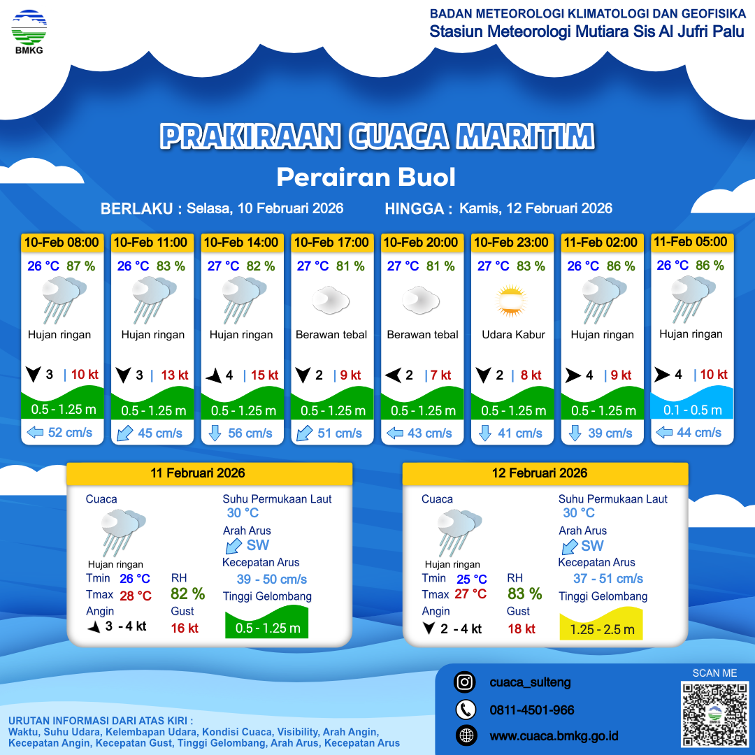 11 Feb 26, 03.00 13 jam kedepan | Barat Laut 5 kt Gust Peningkatan kecepatan angin yang singkat dan tiba-tiba : 14 kt | 1 m Rendah | Selatan 42.0 cm/s | 26 °C | 83 % | |