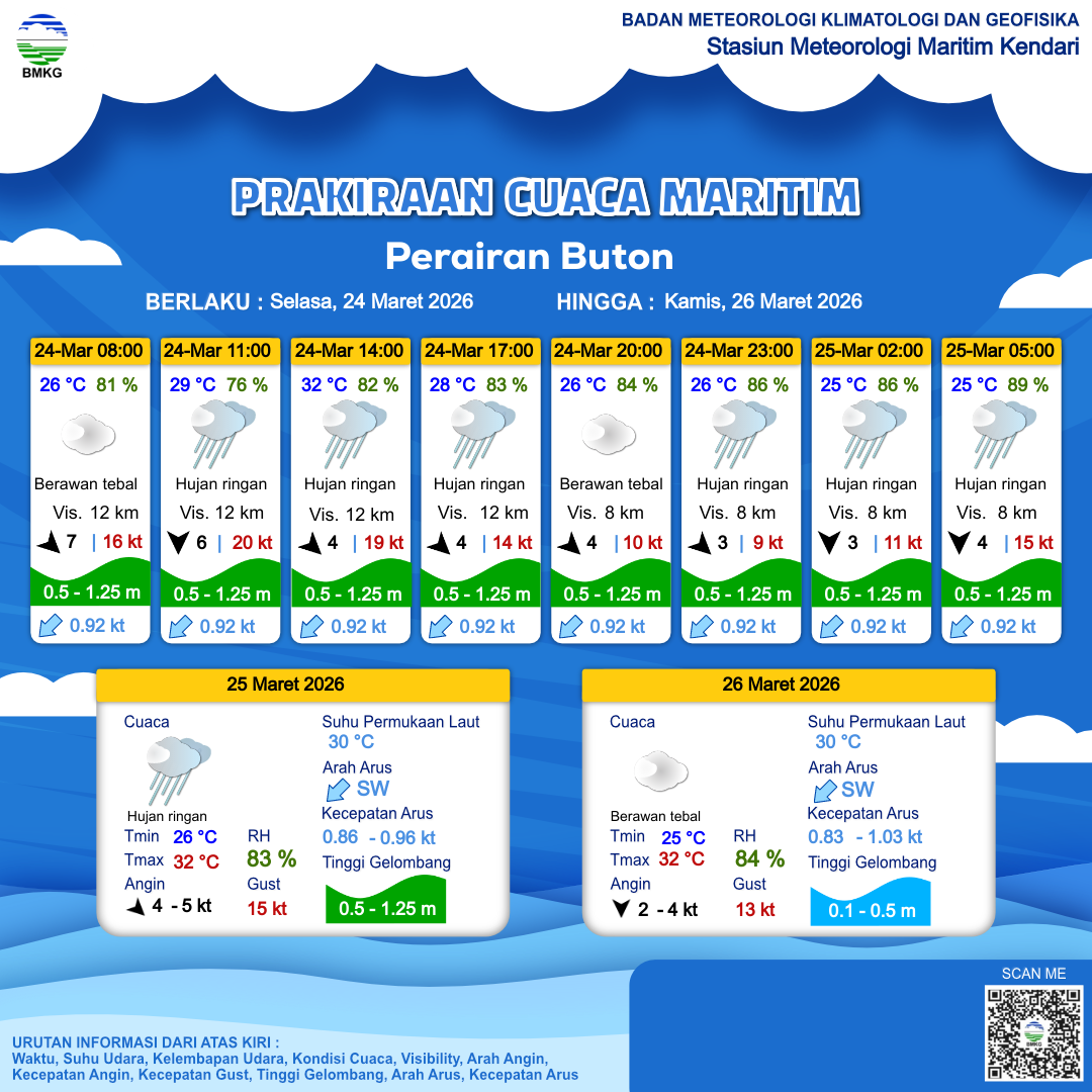 24 Mar 26, 13.00 3 jam kedepan | Barat Laut 4 kt Gust Peningkatan kecepatan angin yang singkat dan tiba-tiba : 13 kt | 1.1 m Rendah | Barat Daya 0.9 Knots | 26 °C | 85 % | |