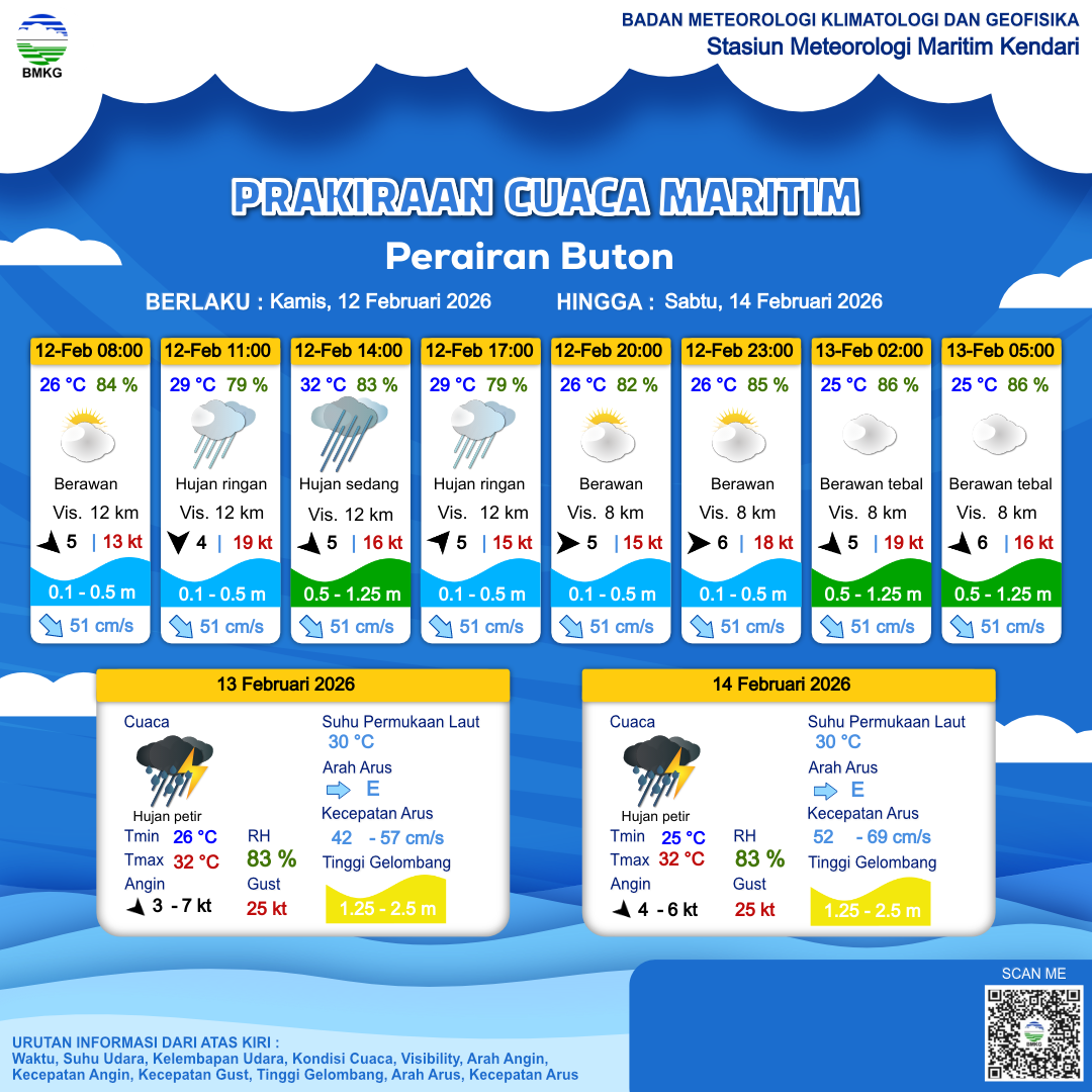 12 Feb 26, 13.00 14 jam kedepan | Barat 5 kt Gust Peningkatan kecepatan angin yang singkat dan tiba-tiba : 15 kt | 0.5 m Rendah | Timur 52.0 cm/s | 26 °C | 83 % | |