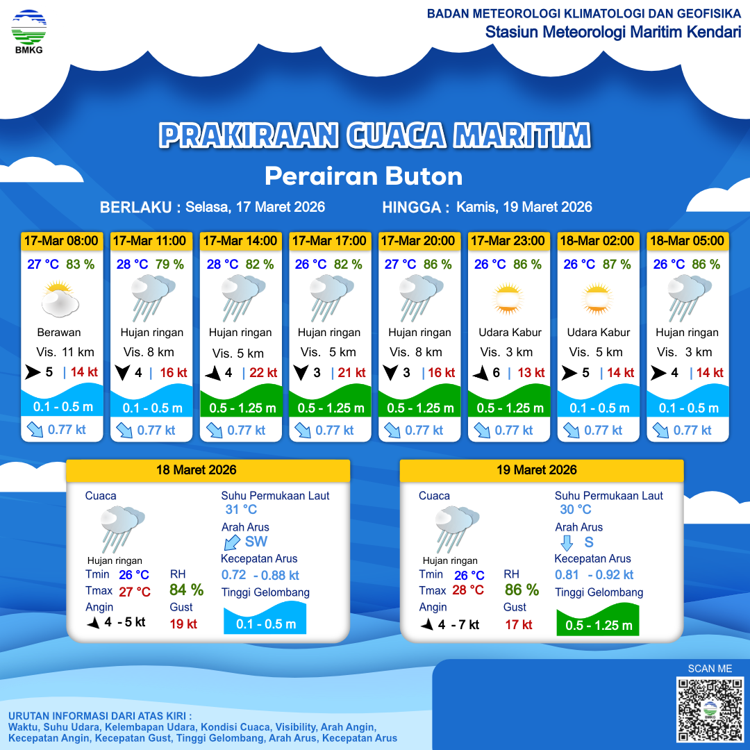 17 Mar 26, 10.00 2 jam kedepan | Utara 3 kt Gust Peningkatan kecepatan angin yang singkat dan tiba-tiba : 20 kt | 1 m Rendah | Barat Daya 0.9 Knots | 27 °C | 82 % | |