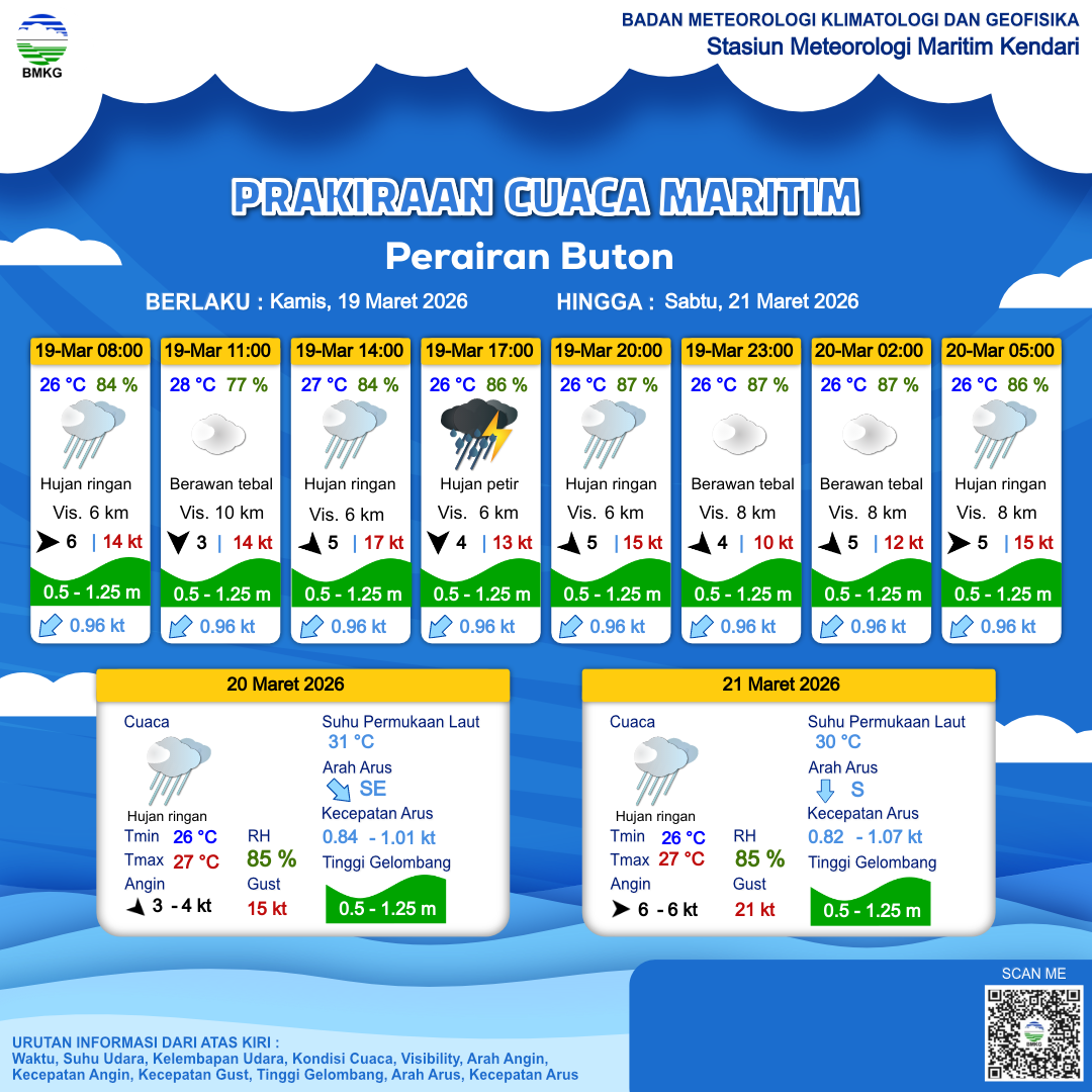 19 Mar 26, 21.00 12 jam kedepan | Barat 5 kt Gust Peningkatan kecepatan angin yang singkat dan tiba-tiba : 15 kt | 0.6 m Rendah | Selatan 0.9 Knots | 26 °C | 86 % | |