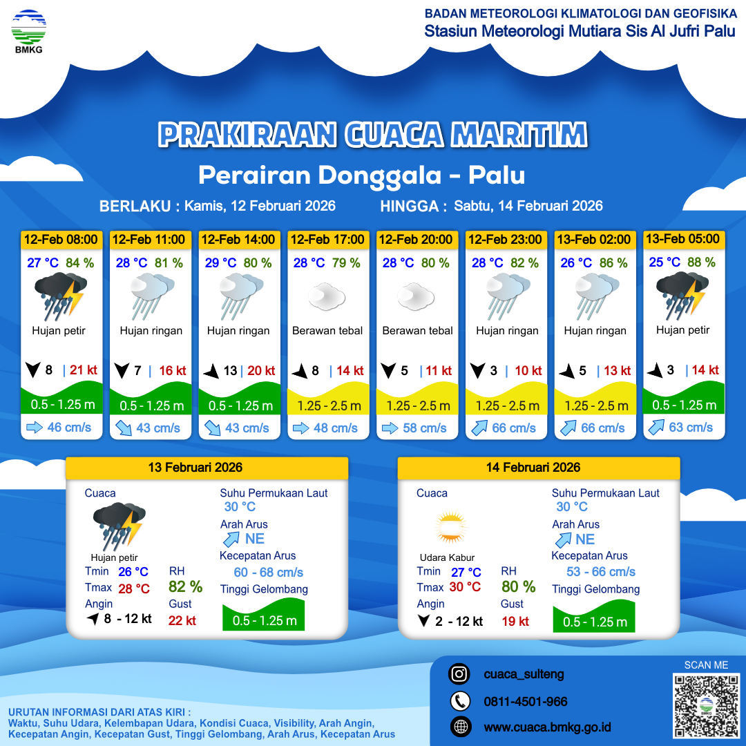 12 Feb 26, 11.00 9 jam kedepan | Utara 5 kt Gust Peningkatan kecepatan angin yang singkat dan tiba-tiba : 11 kt | 1.5 m Sedang | Timur 54.0 cm/s | 28 °C | 80 % | |
