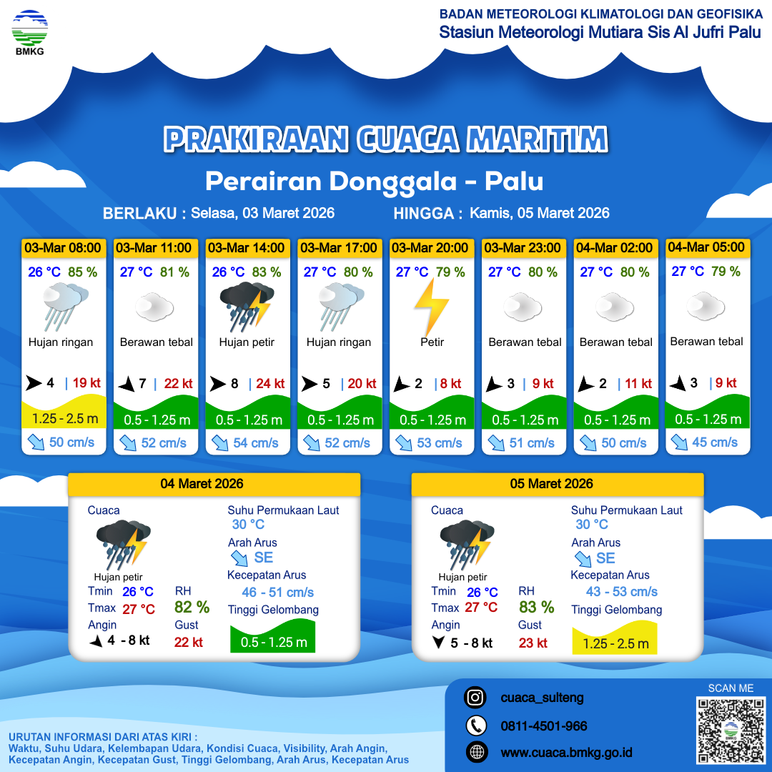 4 Mar 26, 09.00 10 jam kedepan | Barat Laut 9 kt Gust Peningkatan kecepatan angin yang singkat dan tiba-tiba : 22 kt | 0.6 m Rendah | Tenggara 51.0 cm/s | 27 °C | 80 % | |