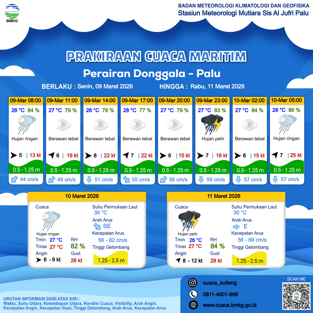 9 Mar 26, 21.00 4 jam kedepan | Barat Daya 7 kt Gust Peningkatan kecepatan angin yang singkat dan tiba-tiba : 25 kt | 0.6 m Rendah | Selatan 57.0 cm/s | 26 °C | 86 % | |