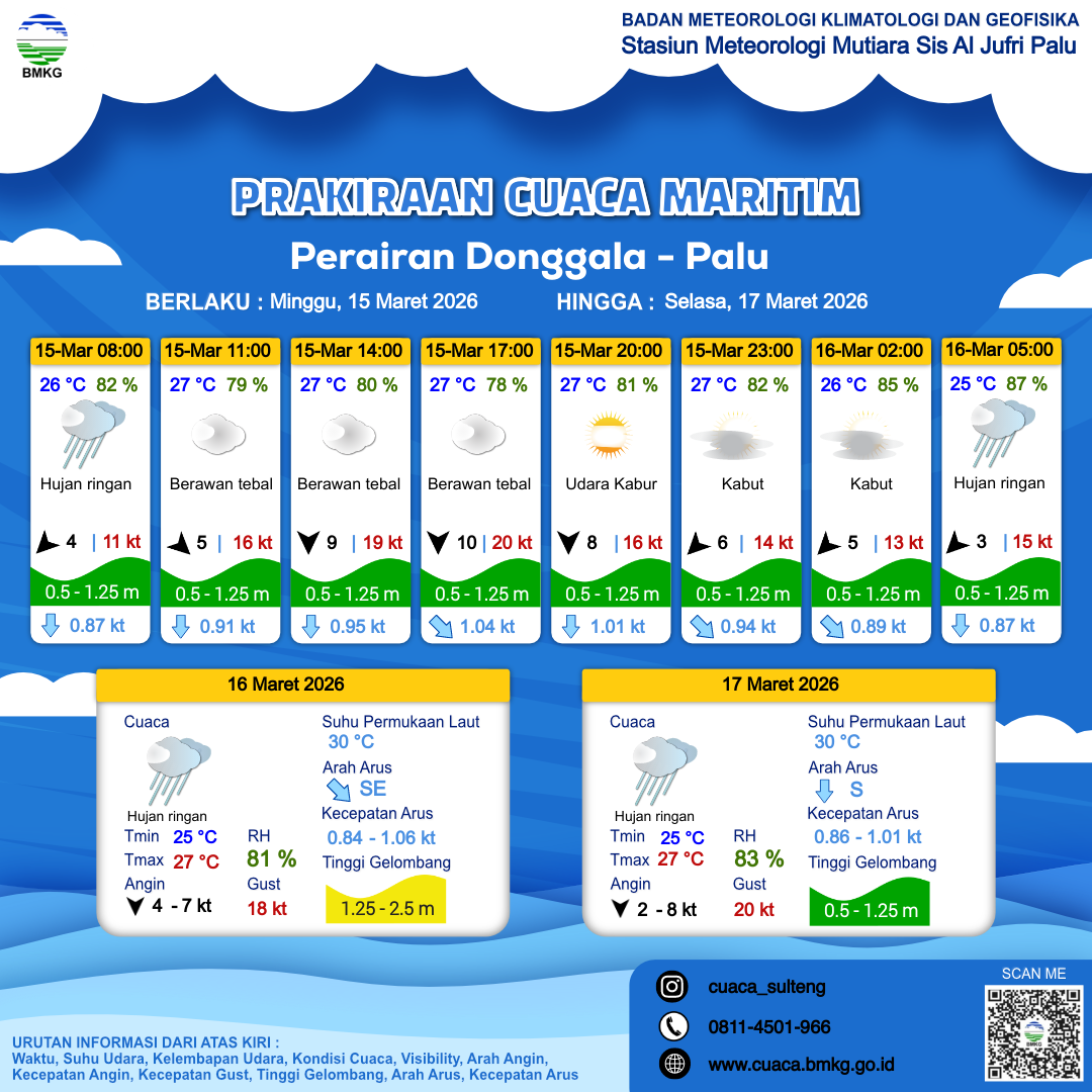 14 Mar 26, 16.00 15 jam kedepan | Timur Laut 6 kt Gust Peningkatan kecepatan angin yang singkat dan tiba-tiba : 13 kt | 0.9 m Rendah | Selatan 45.0 cm/s | 28 °C | 79 % | |