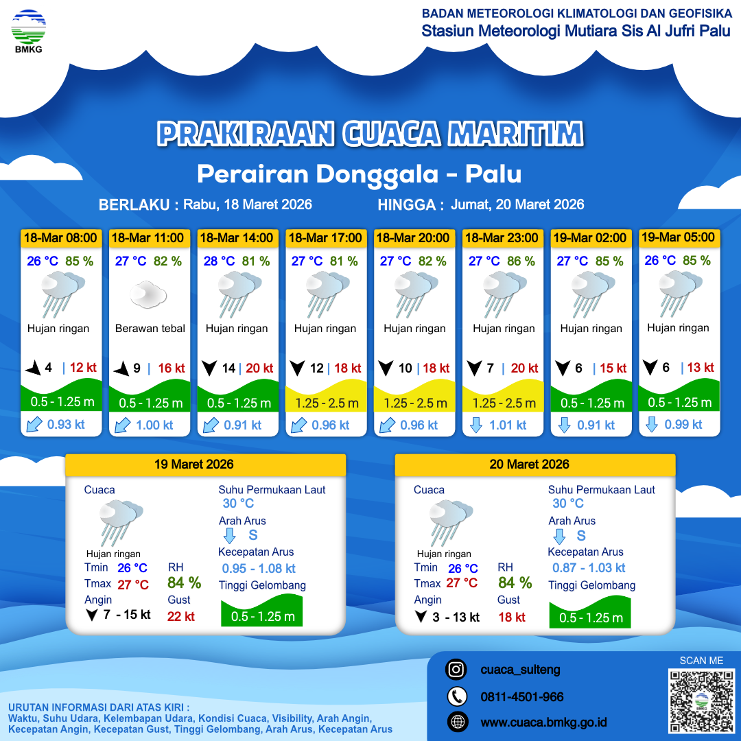 18 Mar 26, 09.00 4 jam kedepan | Utara 12 kt Gust Peningkatan kecepatan angin yang singkat dan tiba-tiba : 18 kt | 1.3 m Sedang | Barat Daya 1.0 Knots | 27 °C | 81 % | |