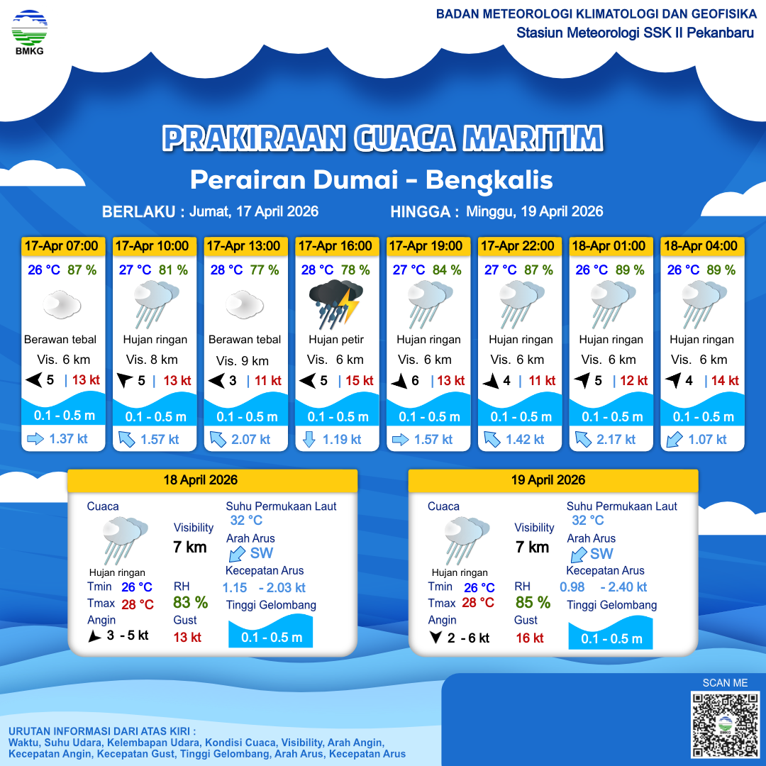 17 Apr 26, 08.00 7 jam kedepan | Timur 5 kt Gust Peningkatan kecepatan angin yang singkat dan tiba-tiba : 14 kt | 0.4 m Tenang | Selatan 1.2 Knots | 28 °C | 78 % | |