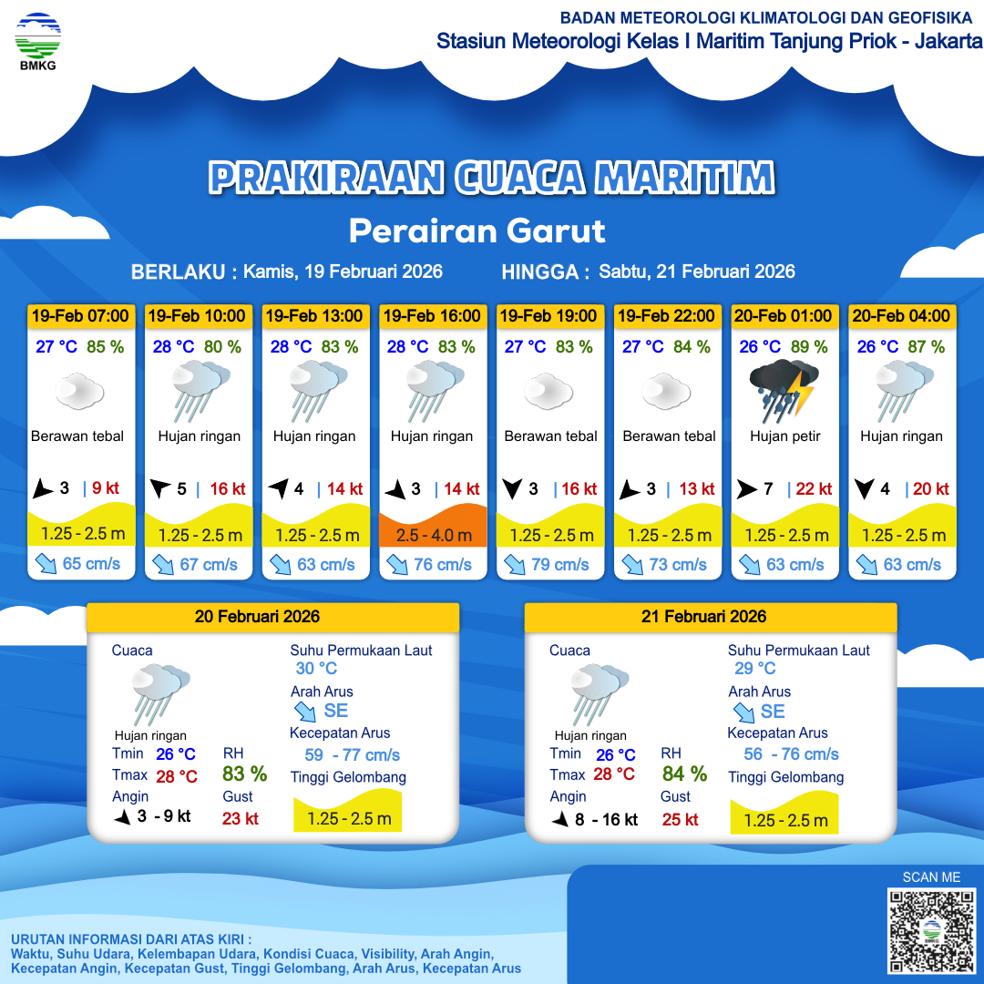 19 Feb 26, 18.00 2 jam kedepan | Barat 7 kt Gust Peningkatan kecepatan angin yang singkat dan tiba-tiba : 22 kt | 2 m Sedang | Tenggara 63.0 cm/s | 26 °C | 89 % | |