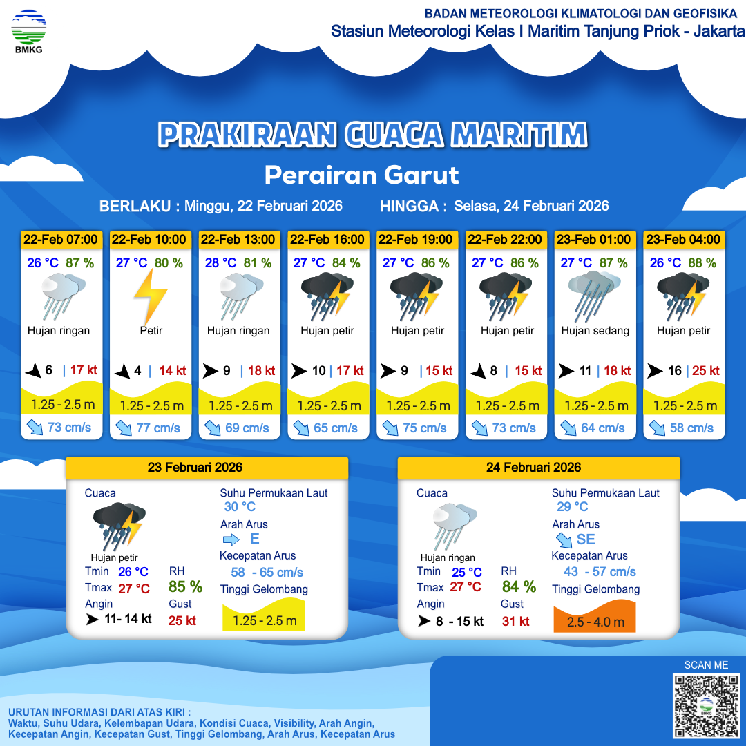 22 Feb 26, 18.00 2 jam kedepan | Barat 11 kt Gust Peningkatan kecepatan angin yang singkat dan tiba-tiba : 18 kt | 1.7 m Sedang | Tenggara 64.0 cm/s | 27 °C | 87 % | |