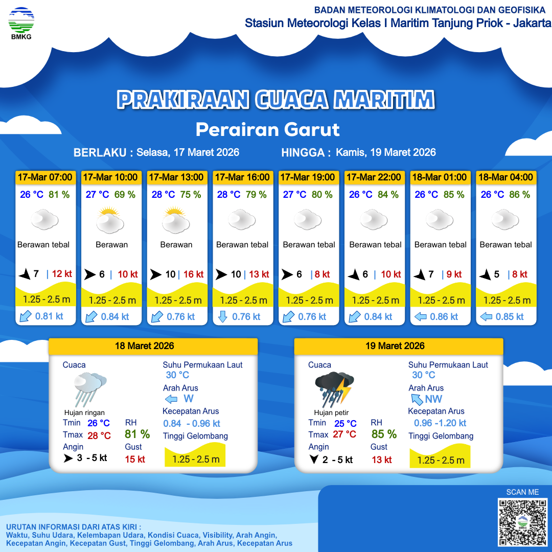 17 Mar 26, 12.00 11 jam kedepan | Barat 6 kt Gust Peningkatan kecepatan angin yang singkat dan tiba-tiba : 8 kt | 1.6 m Sedang | Selatan 0.8 Knots | 27 °C | 80 % | |