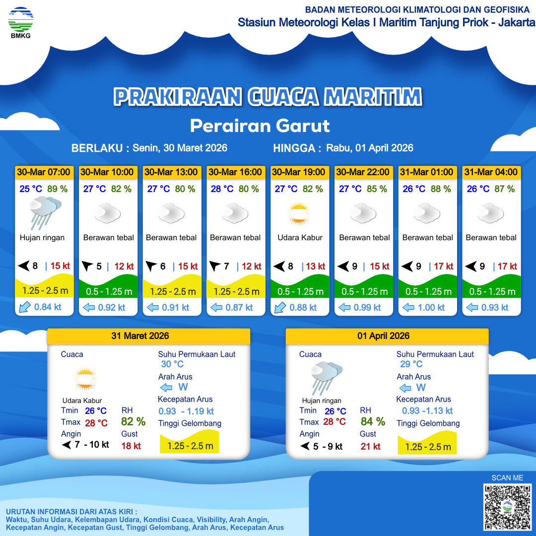 30 Mar 26, 23.00 2 jam kedepan | Berawan Tebal | Timur 8 kt Gust Peningkatan kecepatan angin yang singkat dan tiba-tiba : 17 kt | | | 26 °C | 87 % |
