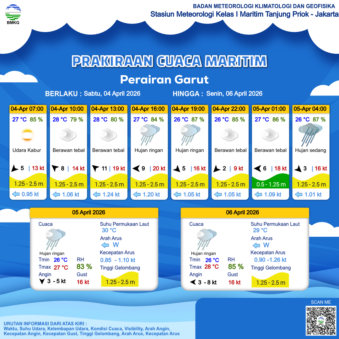 4 Apr 26, 23.00 2 jam kedepan | Hujan Ringan | Timur Laut 5 kt Gust Peningkatan kecepatan angin yang singkat dan tiba-tiba : 13 kt | | | 26 °C | 87 % |