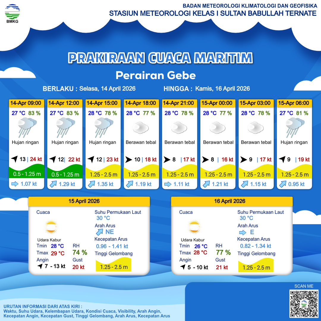 16 Apr 26, 03.00 4 jam kedepan | Barat Daya 6 kt Gust Peningkatan kecepatan angin yang singkat dan tiba-tiba : 12 kt | 1.4 m Sedang | Timur Laut 1.0 Knots | 28 °C | 71 % | |