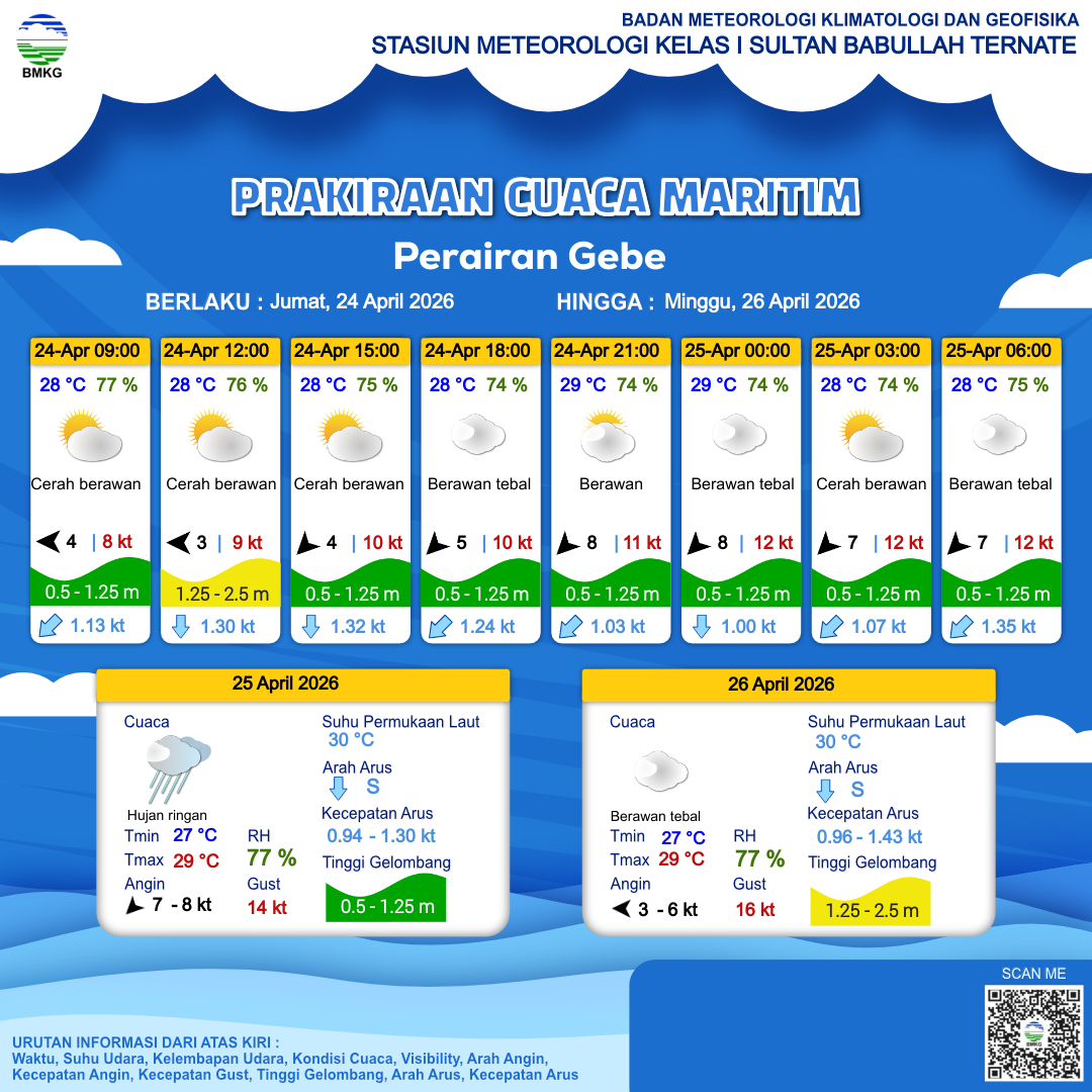 23 Apr 26, 13.00 1 hari 2 jam kedepan | Timur 5 kt Gust Peningkatan kecepatan angin yang singkat dan tiba-tiba : 9 kt | 1.2 m Rendah | Selatan 1.0 Knots | 29 °C | 73 % | |
