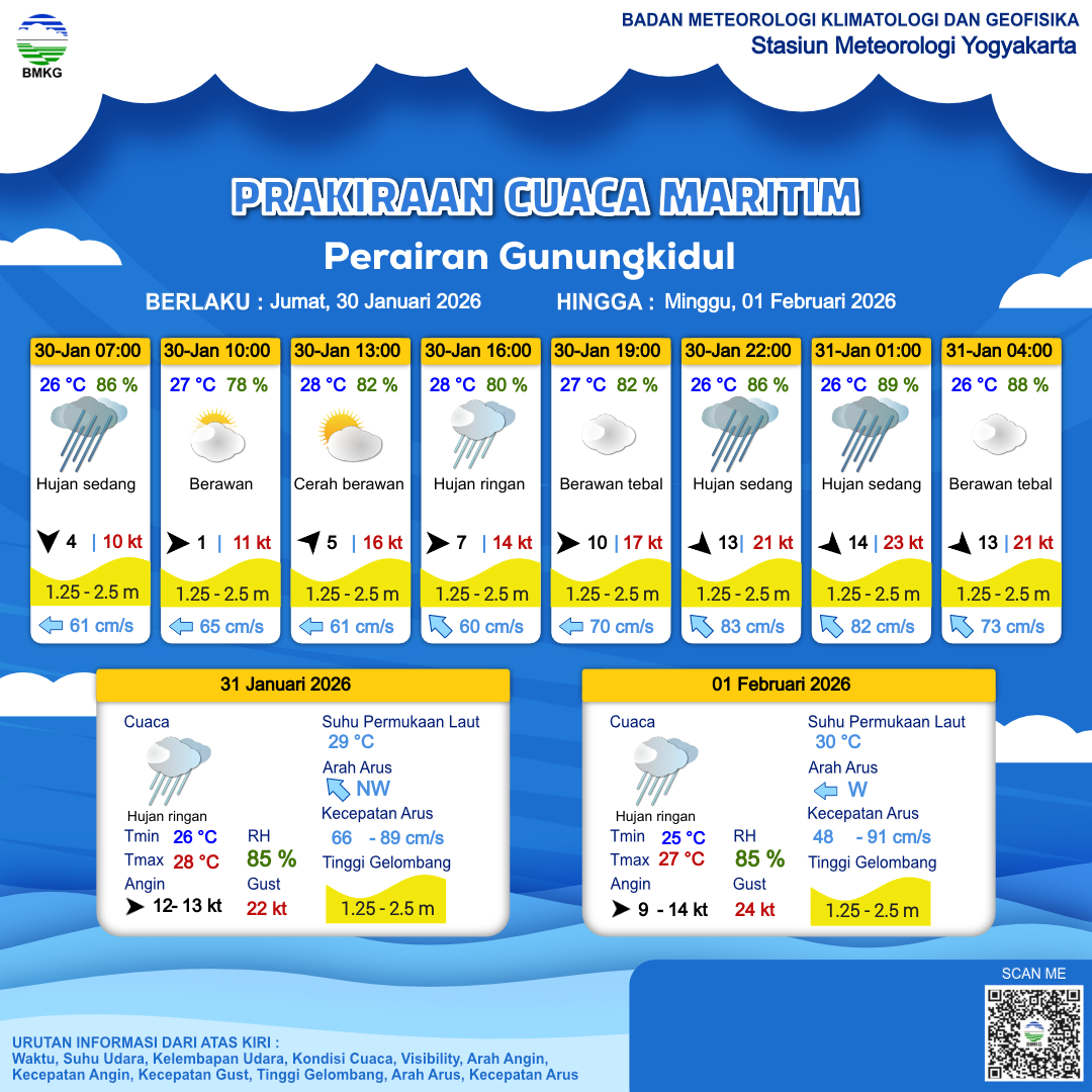 30 Jan 26, 09.00 2 jam kedepan | Barat 7 kt Gust Peningkatan kecepatan angin yang singkat dan tiba-tiba : 14 kt | 2.1 m Sedang | Barat Laut 60.0 cm/s | 28 °C | 80 % | |