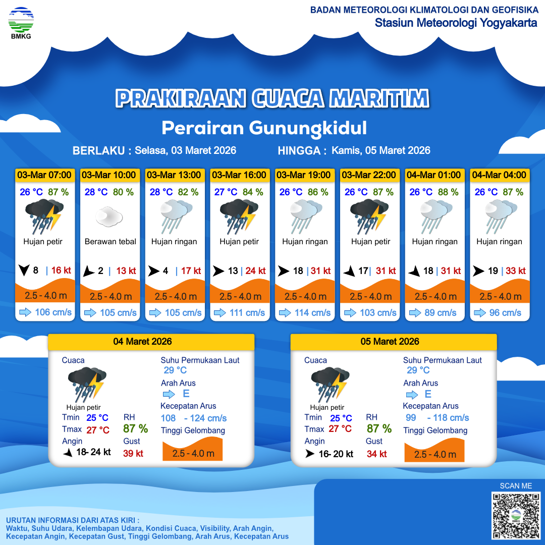 3 Mar 26, 10.00 12 jam kedepan | Barat 13 kt Gust Peningkatan kecepatan angin yang singkat dan tiba-tiba : 25 kt | 3.4 m Tinggi | Timur 113.0 cm/s | 27 °C | 85 % | |