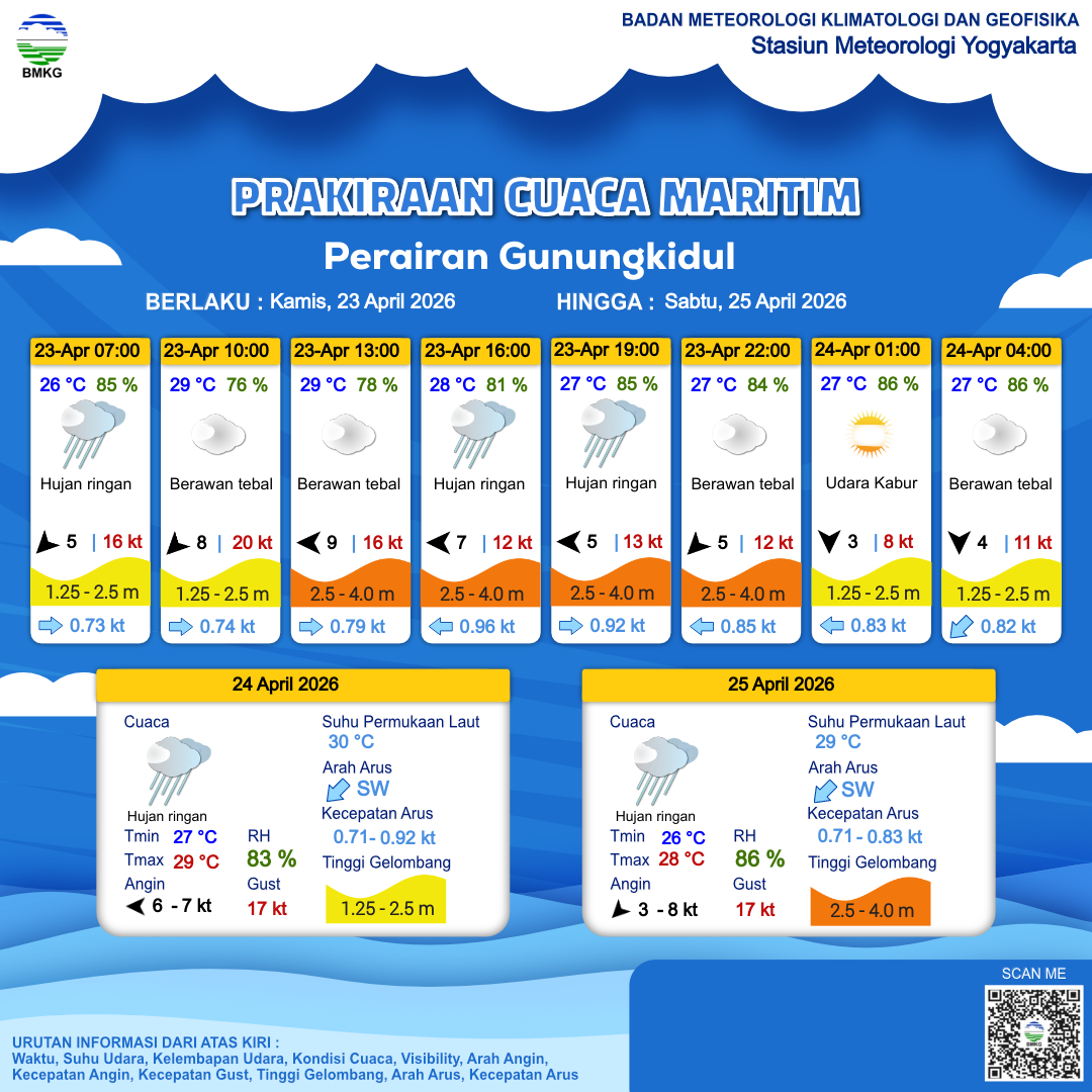 23 Apr 26, 05.00 23 jam kedepan | Timur 9 kt Gust Peningkatan kecepatan angin yang singkat dan tiba-tiba : 17 kt | 2.6 m Tinggi | Barat Daya 0.7 Knots | 29 °C | 73 % | |