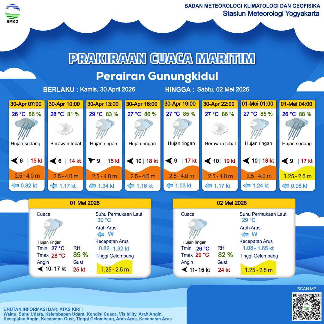 28 Apr 26, 03.00 3 jam kedepan | Tenggara 9 kt Gust Peningkatan kecepatan angin yang singkat dan tiba-tiba : 14 kt | 2.2 m Sedang | Barat Laut 0.9 Knots | 28 °C | 81 % | |
