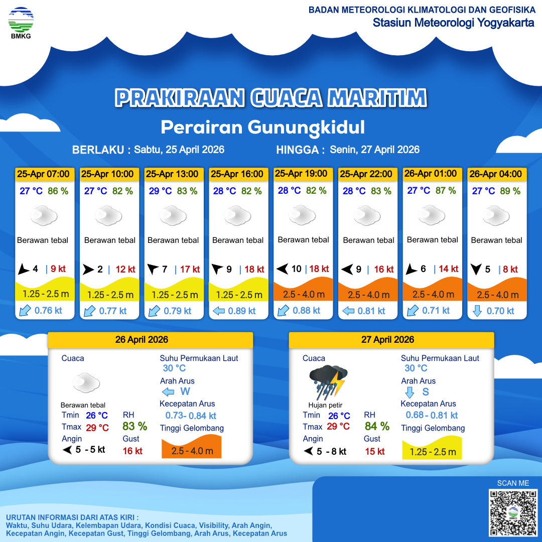 25 Apr 26, 12.00 1 hari 11 jam kedepan | Timur Laut 7 kt Gust Peningkatan kecepatan angin yang singkat dan tiba-tiba : 15 kt | 2.5 m Tinggi | Barat Daya 0.8 Knots | 26 °C | 90 % | |