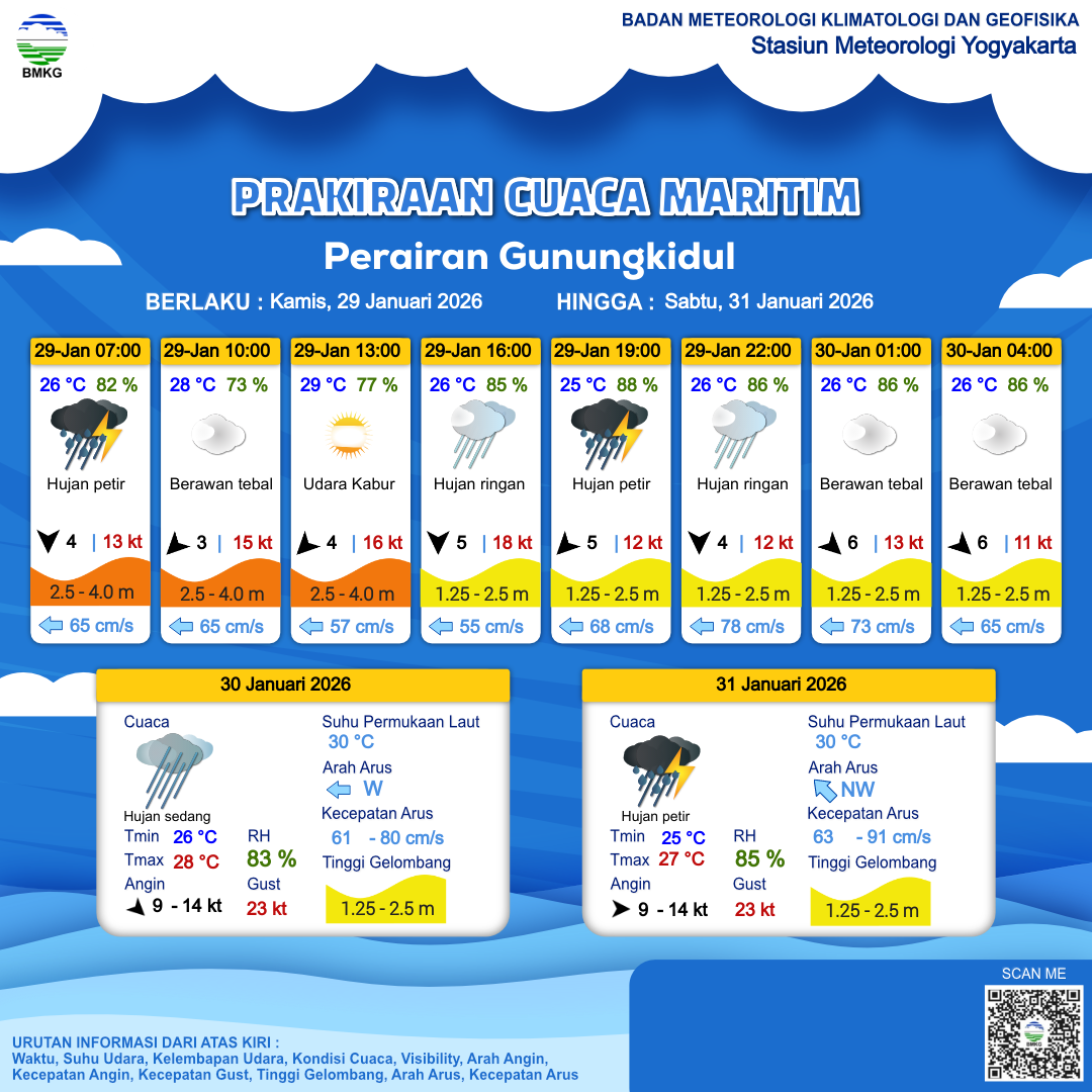 29 Jan 26, 09.00 3 jam kedepan | Utara 5 kt Gust Peningkatan kecepatan angin yang singkat dan tiba-tiba : 18 kt | 2.5 m Tinggi | Barat 55.0 cm/s | 26 °C | 85 % | |