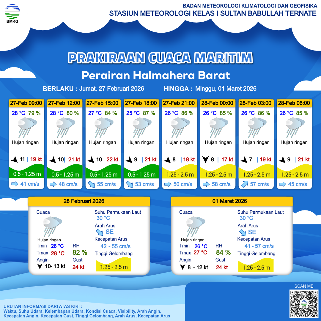 27 Feb 26, 22.00 2 jam kedepan | Udara Kabur | Barat Laut 9 kt Gust Peningkatan kecepatan angin yang singkat dan tiba-tiba : 21 kt | | | 26 °C | 85 % |