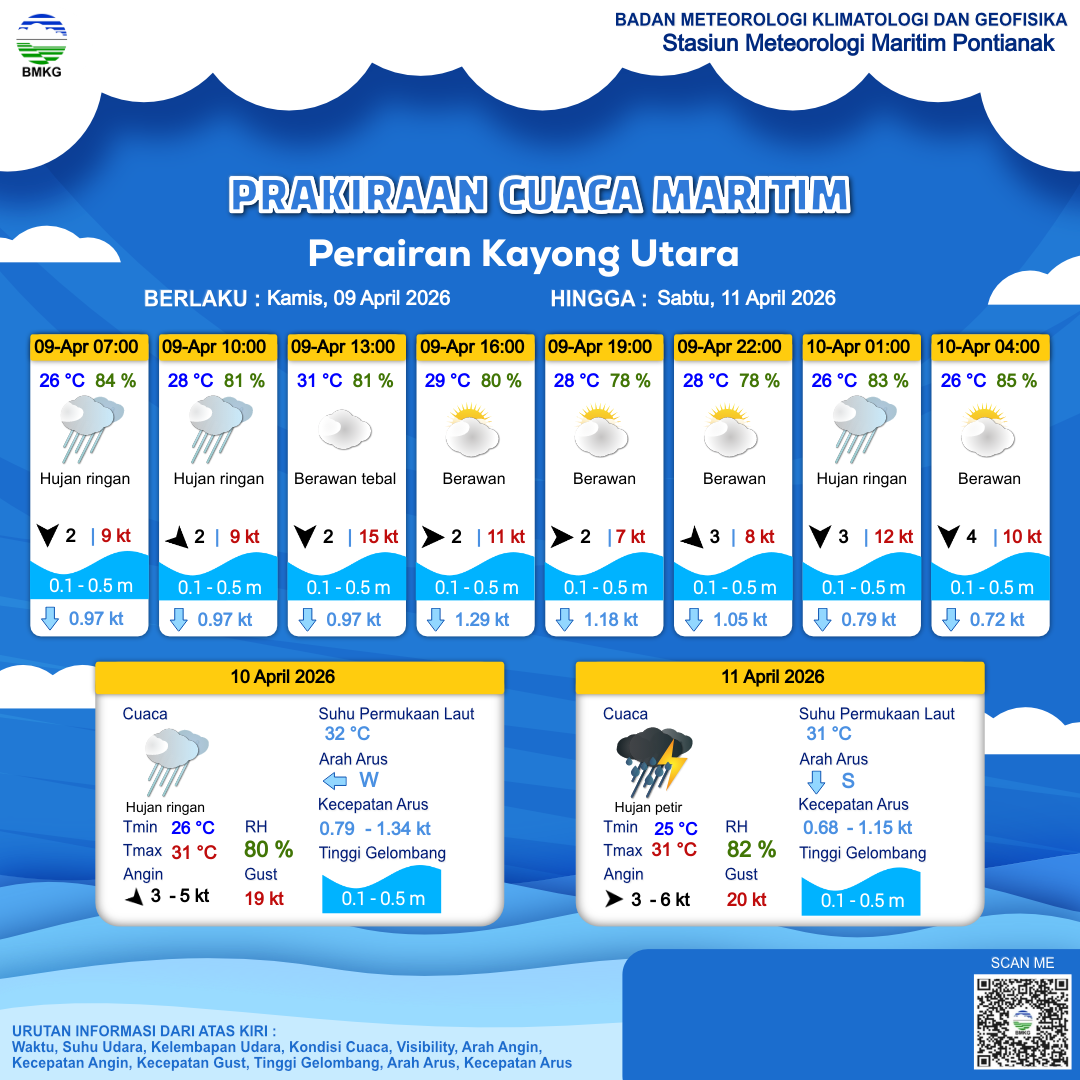 9 Apr 26, 17.00 4 jam kedepan | Utara 3 kt Gust Peningkatan kecepatan angin yang singkat dan tiba-tiba : 10 kt | 0.2 m Tenang | Selatan 0.8 Knots | 27 °C | 81 % | |