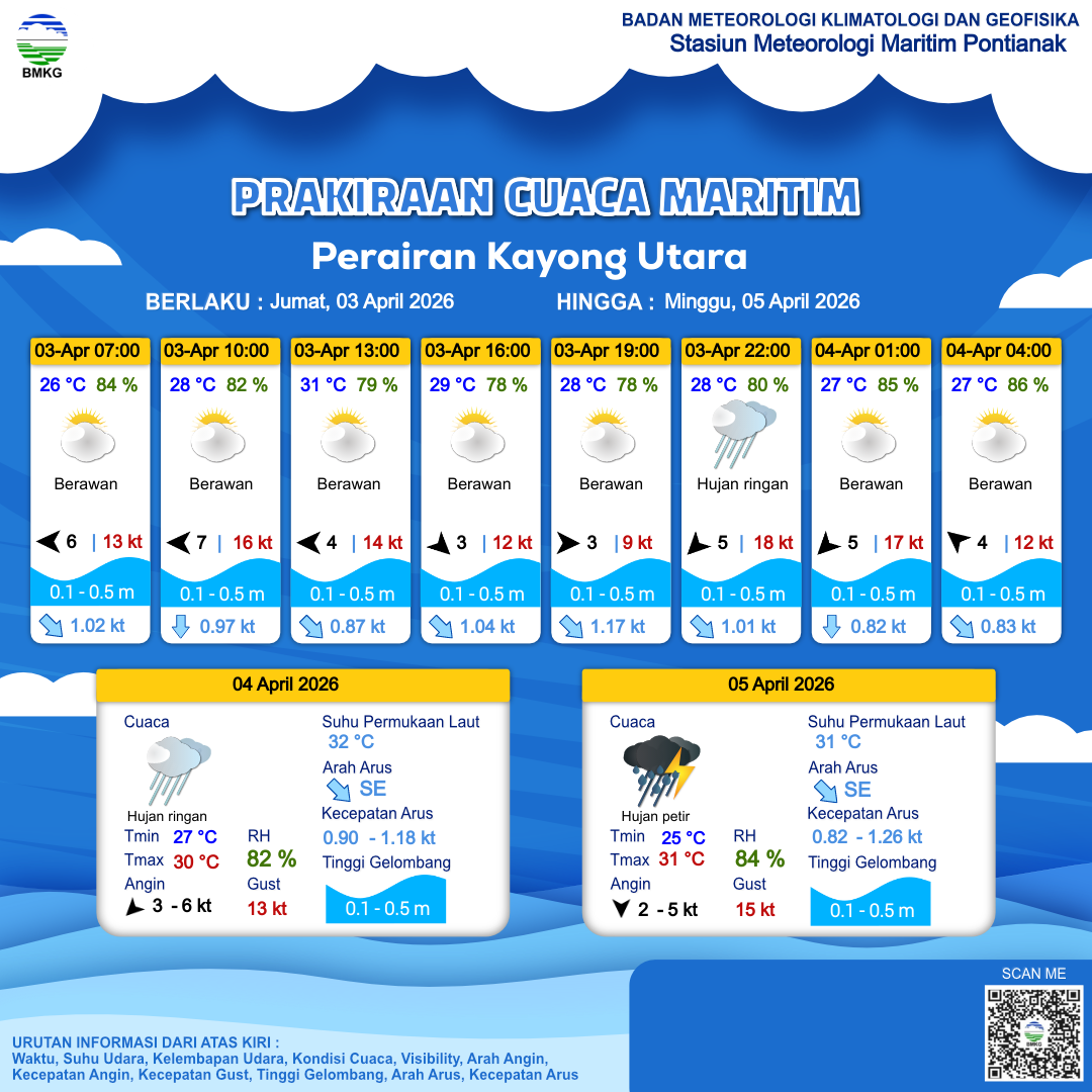 3 Apr 26, 17.00 12 jam kedepan | Timur Laut 5 kt Gust Peningkatan kecepatan angin yang singkat dan tiba-tiba : 17 kt | 0.4 m Tenang | Selatan 0.8 Knots | 27 °C | 84 % | |